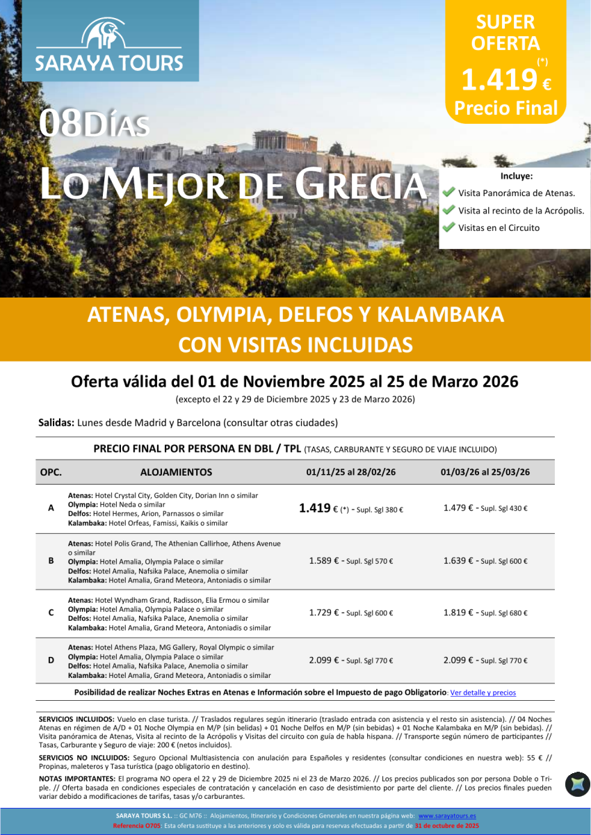 Lo Mejor de Grecia 8 días: Circuito Atenas, Olympia, Delfos, Kalambaka con Visitas Incluidas hasta Oct 26